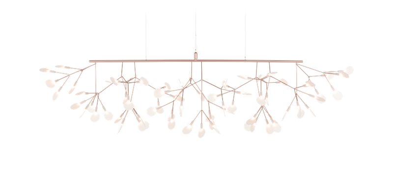Heracleum III Linear, en Moooi Original, från Bertjan Pot kombinerar elegans och funktion. Dess långa ram och uppåtsvängande blommor gör den idealisk för matbord eller köksöar. Drivs av Electrosandwich® från Marcel Wanders skapar den ett varmt sken med ljusa LED-lampor.